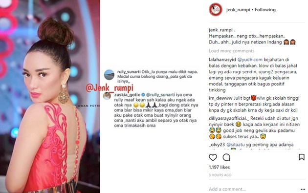Gotik pun sempat meminta maaf di awal komentarnya. "Iya oma rully maaf keun yah kalau aku ngak ada otaknya. Bagi dong otaknya oma biar bisa mikir kayak oma dan biar aku pake otak oma buat nyinyir orang oma. Nanti aku ambil separo ya otaknya oma trimakasih oma," jawab Gotik.